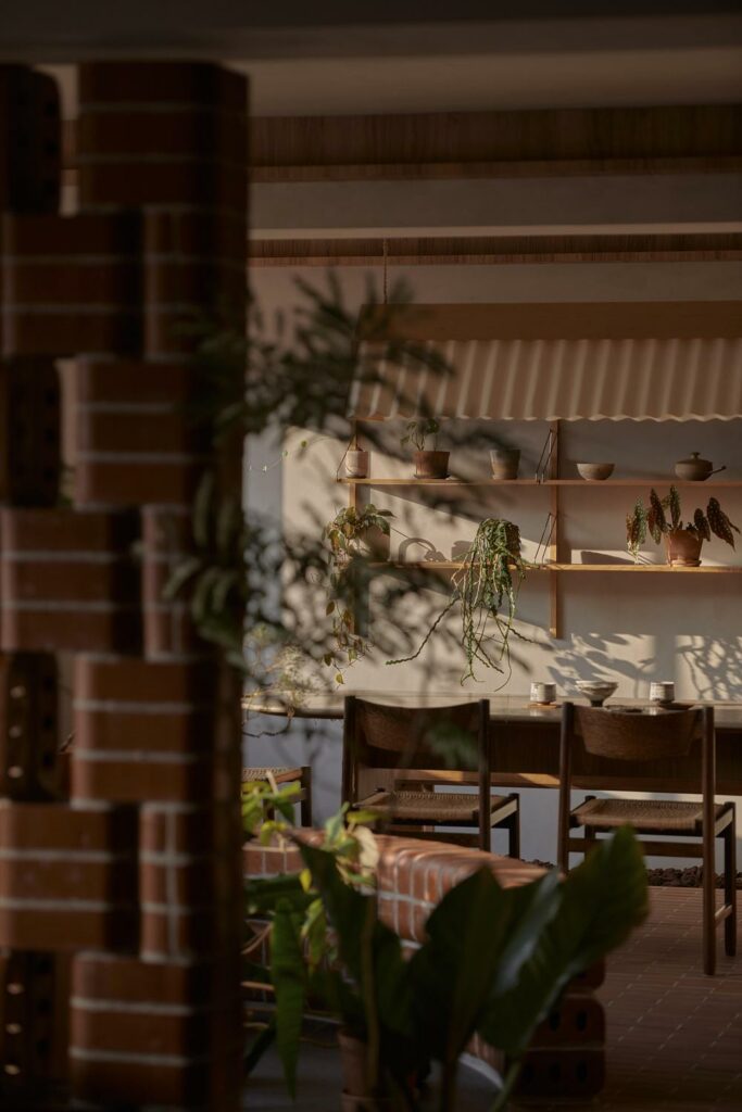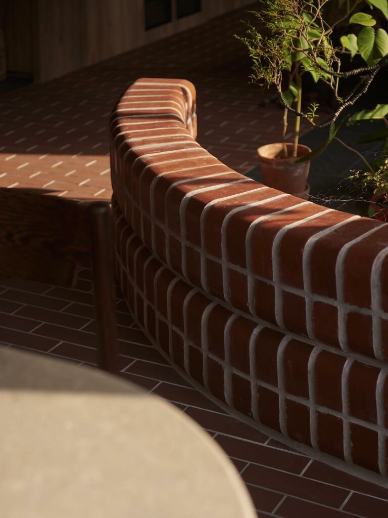 Pour matérialiser l’idée du parc intérieur, le studio évite les matériaux contemporains. Il fouille la mémoire de Singapour et y retrouve la double-bullnose brick. Cette brique aux arêtes arrondies ornait les bancs des parcs publics, les bordures de cheminements et les jardinières en plein air. Ce matériau du quotidien est désormais presque invisible à force de familiarité.