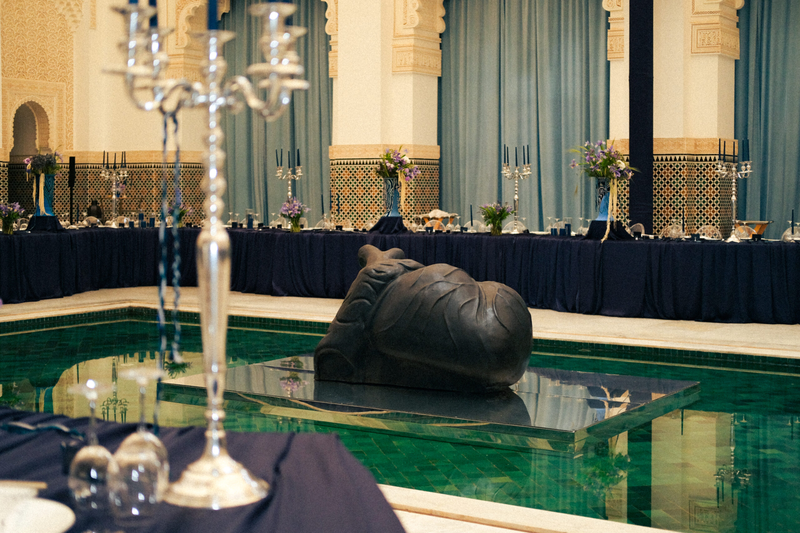La scénographie, imaginée par Atelier Shades by Nahla Hemeda, a déployé une écriture sobre et sensorielle, où l’eau, les reflets et une palette de bleus dialoguaient avec l’architecture du lieu. La direction artistique, assurée par Anfas, a veillé à l’harmonie d’ensemble et à la cohérence visuelle de chaque détail. La production, orchestrée par Philanthropy Wedding, a assuré la précision et la fluidité de chaque séquence.