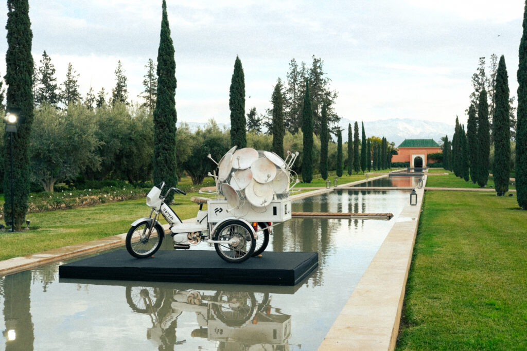 À l’extérieur, le parcours s’est ouvert sur Parabomobile de Hiba Baddou. Cette Peugeot 103 transformée en sculpture mobile, surmontée de vingt-et-une paraboles, a introduit une dimension plus prospective : une œuvre en mouvement interrogeant la circulation des images, le désir d’ailleurs et les formes contemporaines de l’errance.