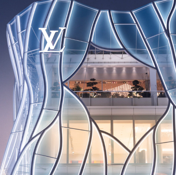 La façade, inspirée des jardins chinois, compose une enveloppe végétale et rythmée, jouant sur les pleins et les vides, les transparences et les filtres. À l’intérieur, une séquence d’espaces fluides articule boutique, lieux de pause et « LV Café », pensé comme un salon culturel autant que gastronomique.
