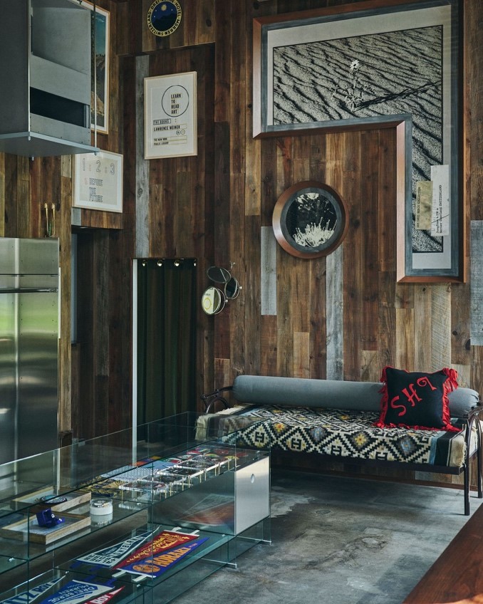 À l’intérieur, le décor conçu avec son agence Art Recherche Industrie joue sur les contrastes. Bois récupérés, textures brutes et chaleur artisanale s’entrelacent avec le béton poli, l’acier minimaliste et les étagères bleu électrique. Le lieu n’est ni une boutique ni une galerie, mais une scène où chaque détail traduit un équilibre subtil entre rusticité alpine et rigueur urbaine. Au plafond, deux enceintes Altec Lansing diffusent la musique comme une pluie sonore, affirmant combien le son est partie intégrante de l’identité des lieux.