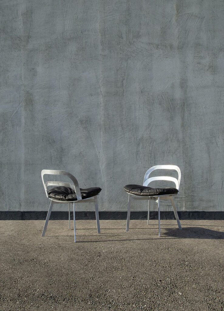 Le studio parisien crée de la légèreté à travers le métal. De l’aluminium soudé et poli forme un fauteuil lounge minimaliste, complété par un coussin vissé en cuir ou en tissu. Simple, précis, et discrètement industriel.