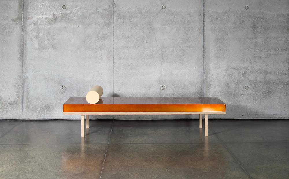 Sedelmeier embrasse l’imprévisibilité des matériaux. Ses miroirs teintés bronze présentent des taches de pigments noirs — spontanées et uniques. Ils sont complétés par des bancs et tables en bois, habillés de peaux métalliques en chrome, cuivre, poudre brillante ou acier galvanisé à chaud. Des objets à mi-chemin entre fonction et sculpture.
